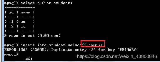 Create table t1( Id int primary key, Name varchar(100) ); Insert into t1 values(1,'zs'); Insert into t1 values(2,'ls');