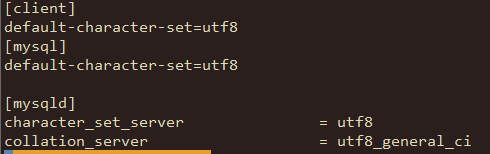 [client] default-character-set=utf8 [mysql] default-character-set=utf8 [mysqld] character_set_server = utf8 collation_server = utf8_general_ci