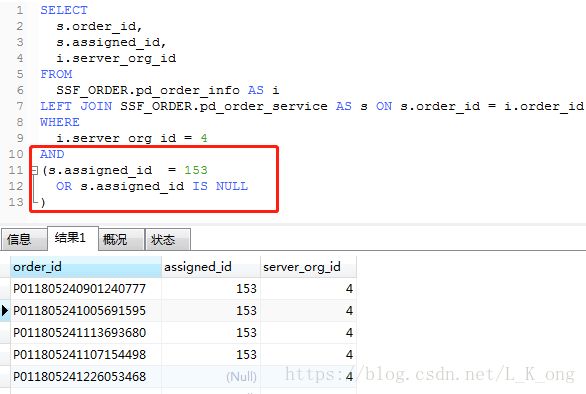 今天有这样得一个需求,如果登陆人是客服的话,会查询订单是’该客服’以及还没有匹配客服的,刚开始想的是直接在sql语句上拼写 or assigned_id is null 的,测试了一下发现这样的话,前面的其他条件都没有用了