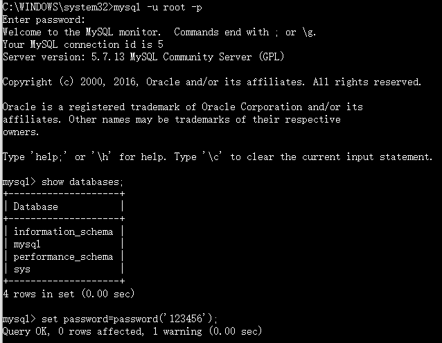 update mysql.user set authentication_string=password('123456') where user='root' and Host = 'localhost';//修改密码
