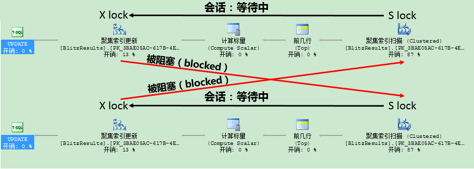 首先在更新查询计划里,更新锁用来避免死锁情形。假设在计划的第1阶段,有多个更新查询计划获得共享锁(Shared(S)Locks),然后在查询计划的第3阶段,当数据最后被修改时,这些共享锁(Shared Locks)转化为排它锁(Exclusive Loks),会发生什么:
