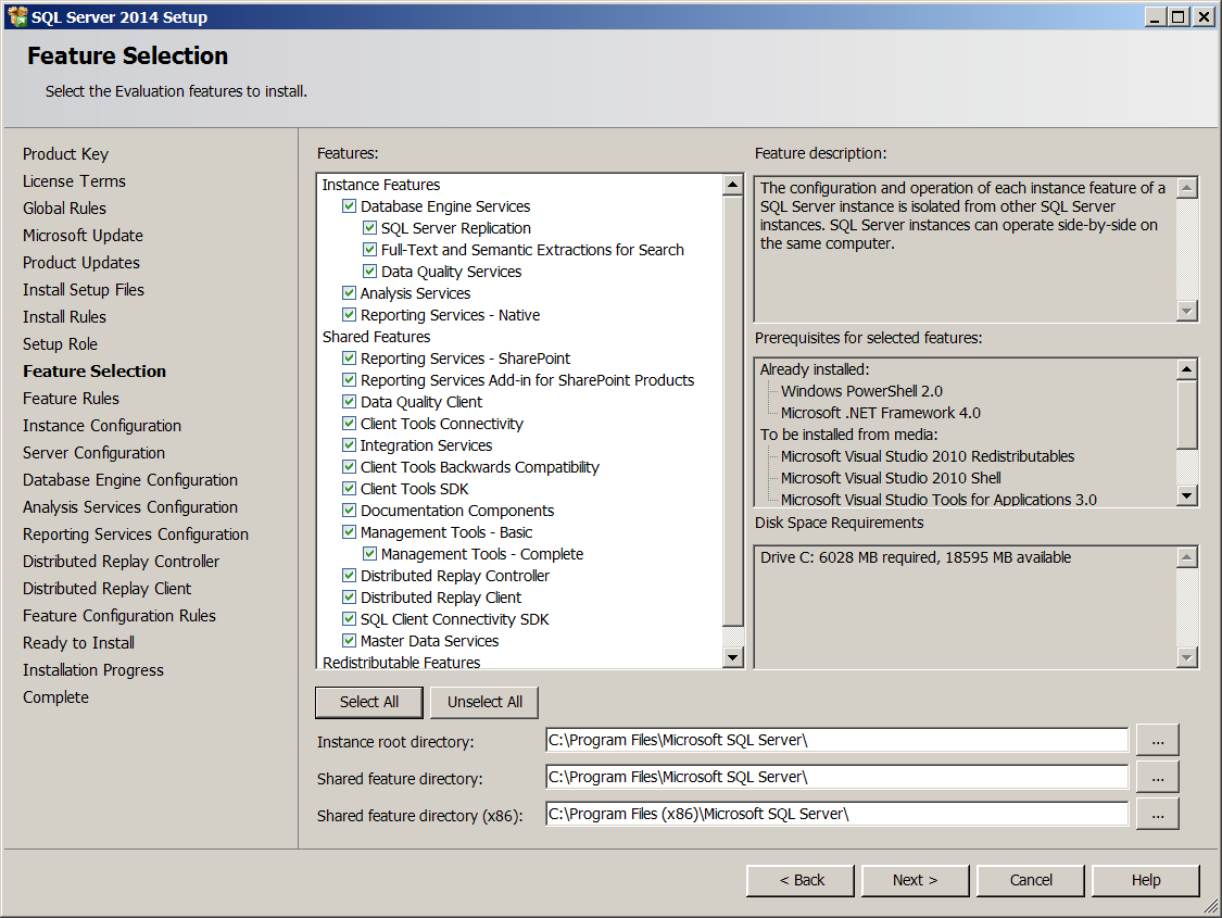 默认全部安装,虽然 BI 只需要用到 SSIS, SSRS, SSAS 但是为了成功安装还是全选了吧,反正虚机空间是足够了的。