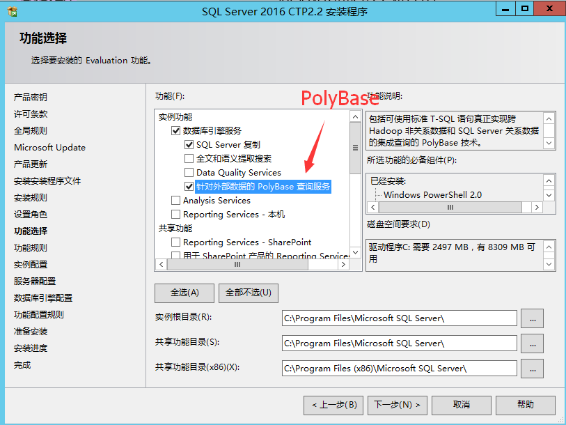 安装过程中的第一个坑来了,如果你勾选了PolyBase,它是需要安装JAVA JRE的,因为它需要调用JRE来查询hadoop数据