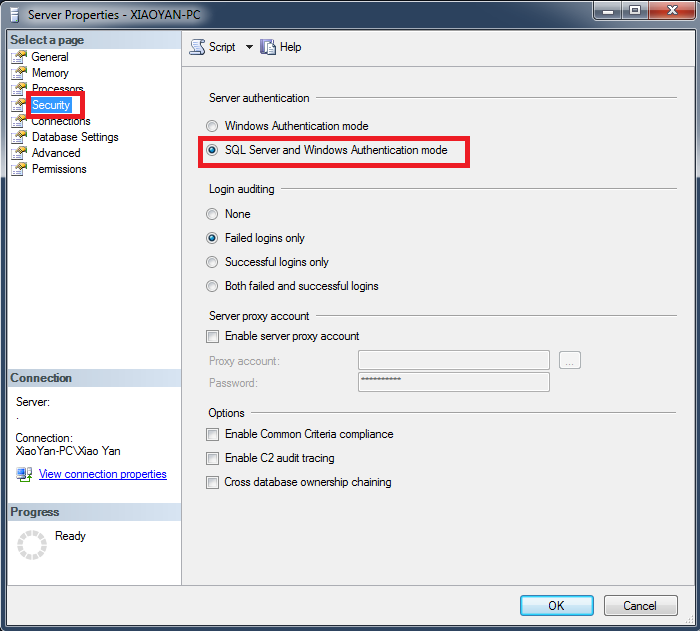 如果安装的时候没有选择“混合登录”,那么可以先WindowsAuthertication登录进去后修改配置: