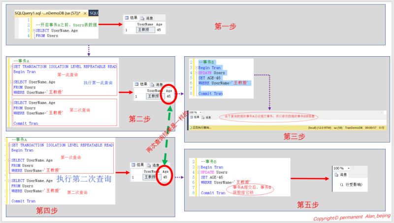 为了防止不可重复读现象,SQL Sever中采用隔离级别升级的方式,即将已提交读升级为可重复读。在可重复读隔离级别下,事务中的读操作不仅能获得共享锁,