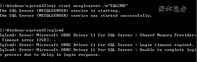 注意:如果以单用户模式启动,然后以sqlcmd去连接数据库,就会出现下面错误,所以必须以单用户模式+最小配置启动数据库实例