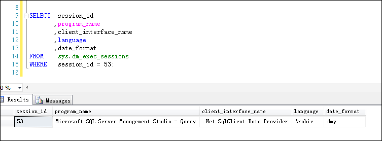 SELECT session_id ,program_name ,client_interface_name ,language ,date_format FROM sys.dm_exec_sessions WHERE session_id = 53;