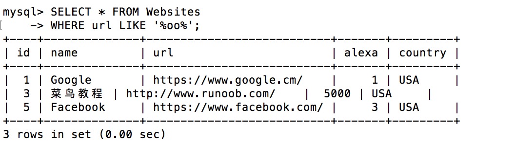 | id | name | url | alexa | country | +----+--------------+---------------------------+-------+---------+ | 1 | Google | https://www.google.cm/ | 1 | USA | | 2 | 淘宝 | https://www.taobao.com/ | 13 | CN | | 3 | 菜鸟教程 | http://www.runoob.com/ | 4689 | CN | | 4 | 微博 | http://weibo.com/ | 20 | CN | | 5 | Facebook | https://www.facebook.com/ | 3 | USA | | 7 | stackoverflow | http://stackoverflow.com/ | 0 | IND | +----+---------------+---------------------------+-------+---------+