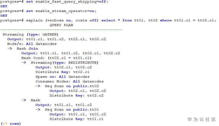 两表JOIN,且其连接条件为各表的分布列,在关闭stream算子的情况下,CN会直接将该语句发送至各DN执行,最后结果在CN汇总。