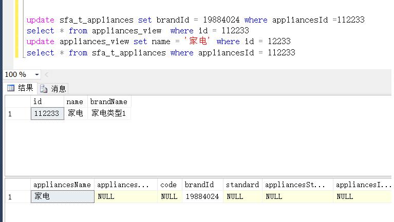 注意视图的创建语法:是通过关联关系获取到的数据。注意观看视图的三个字段的来源。自然,在appliancesID为112233的记录中没有brandID,所以自然不能读取到数据。