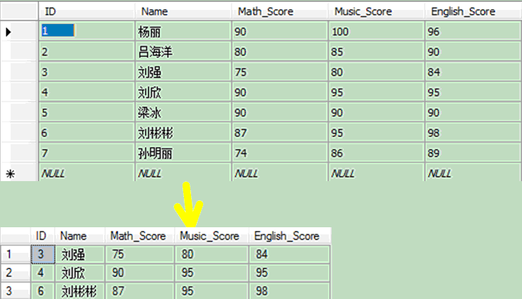 例如:查询姓刘的学生数学成绩以最后一位数不是7或者是英语在90分以上的