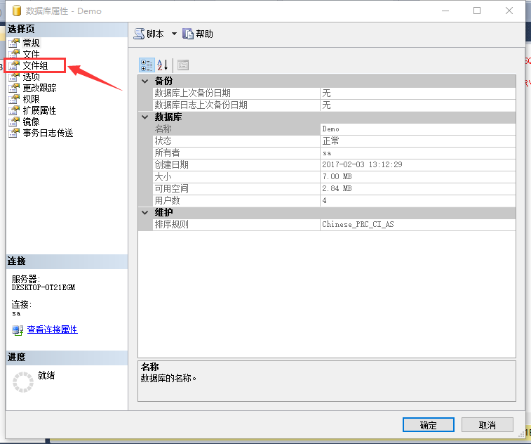 ② 在创建的数据库中添加文件组