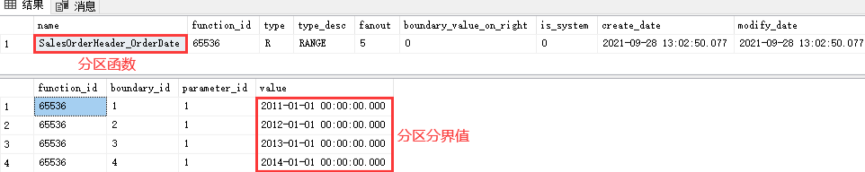 SELECT * FROM SYS.PARTITION_FUNCTIONS --分区函数 SELECT * FROM SYS.PARTITION_RANGE_VALUES --分区方案
