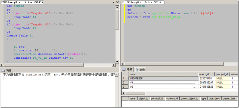 右边的查询,只看到在sys.tables表哦中存在刚才创建的临时表#1和#2,在sys.foreign_keys看不到有关Foreign Key约束信息。这也验证了左边SQL Server提示的,在临时表中无法强制使用Foreign Key约束。
