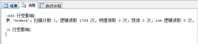 同样我们强制使用了索引IX_OrderDate,查询条件进行改变,逻辑读达到了1724次,返回行数数830行