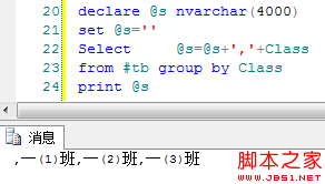 上面的简化,对于菜鸟级的我,理解着还是非常吃力的,所以我是在知道答案后,用 print @s一步一步的去分析的,特别是在select @s=@s+…..的时间,在这里我找到了一种把单列数据连接成字符串的方法。