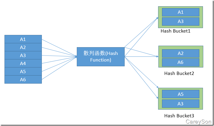 图12中,将输入源中的每一个条目经过散列函数的计算都放到不同的Hash Bucket中,其中Hash Function的选择和Hash Bucket的数量都是黑盒,微软并没有公布具体的算法,但我相信已经是非常好的算法了。另外在Hash Bucket之内的条目是无序的。通常来讲,查询优化器都会使用连接两端中比较小的哪个输入集来作为第一阶段的输入源。